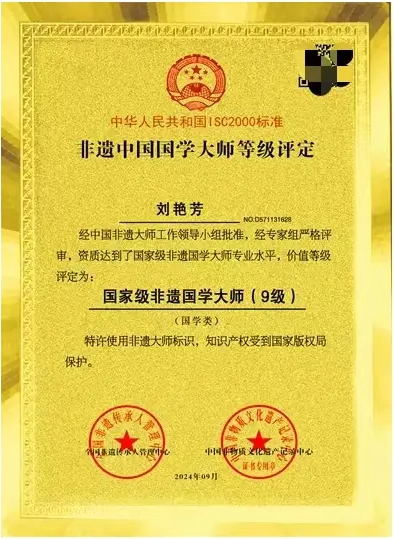 2024年9月经中国非遗大师工作领导小批准,经专家组严格评审,资质达到了国家级非遗国学大师专业水平,价值等级评定为:国家级非遗国学大师(9)级,特许使用非遗大师标识,知识产权受到国家版权局保护。